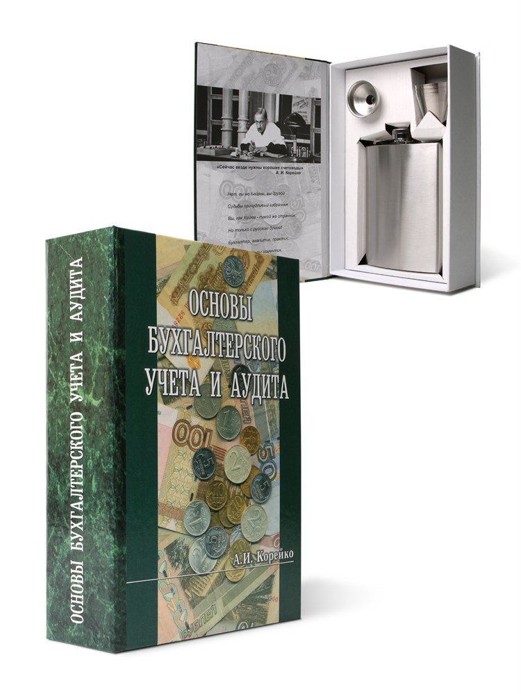 Книга-шкатулка "Основы бухгалтерского учета и аудита" (метал. фляга, 3 рюмки, воронка)